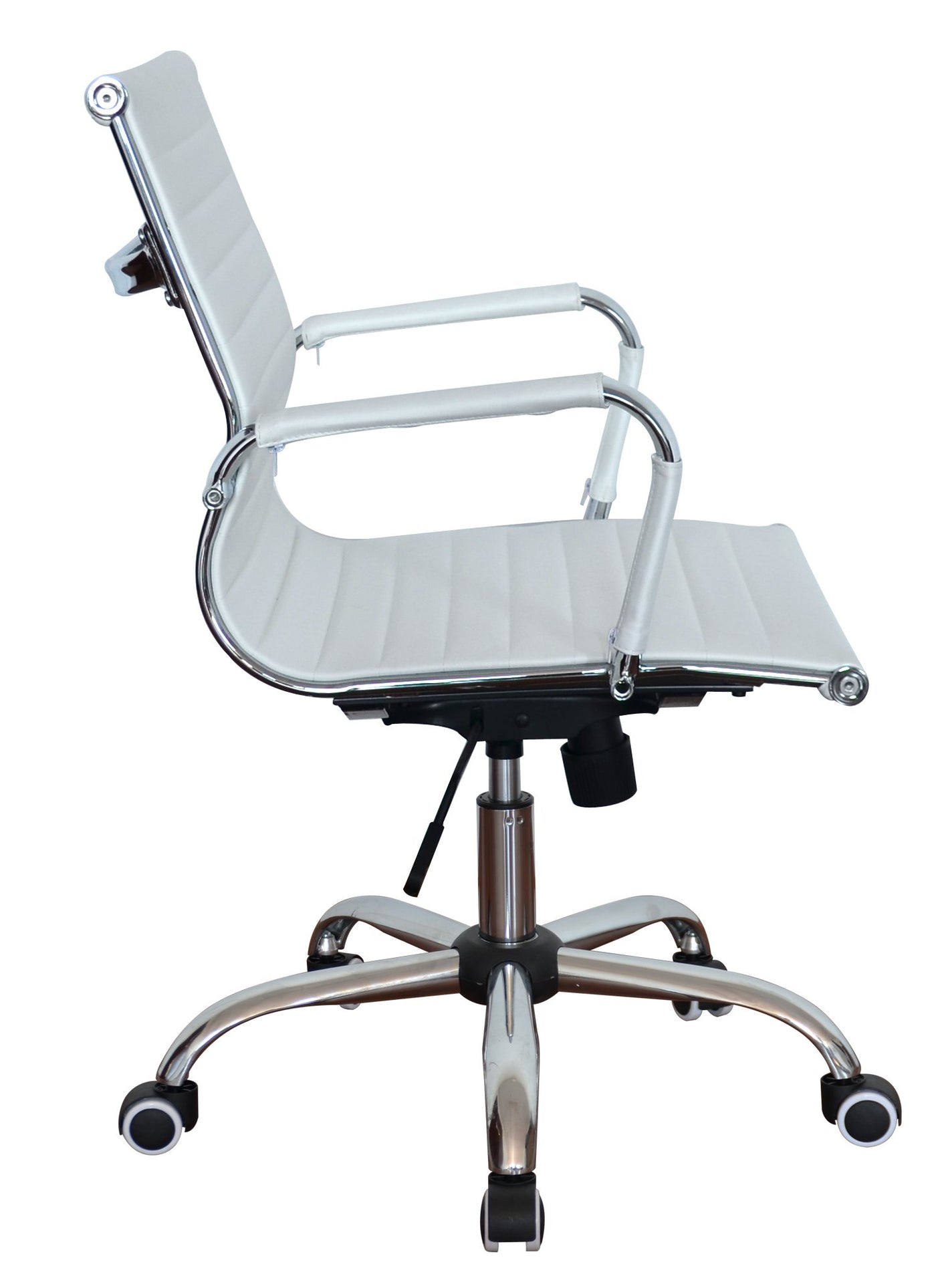 Versatility is this desk chair’s most incredible feature. This classic ribbed black vegan leather medium back office chair has an improved sturdy structure, and the best high quality vegan leather with fire retardant foam, CA117. This desk chair is perfect for any home office, conference rooms, boardrooms, executive offices, and can be used as a...